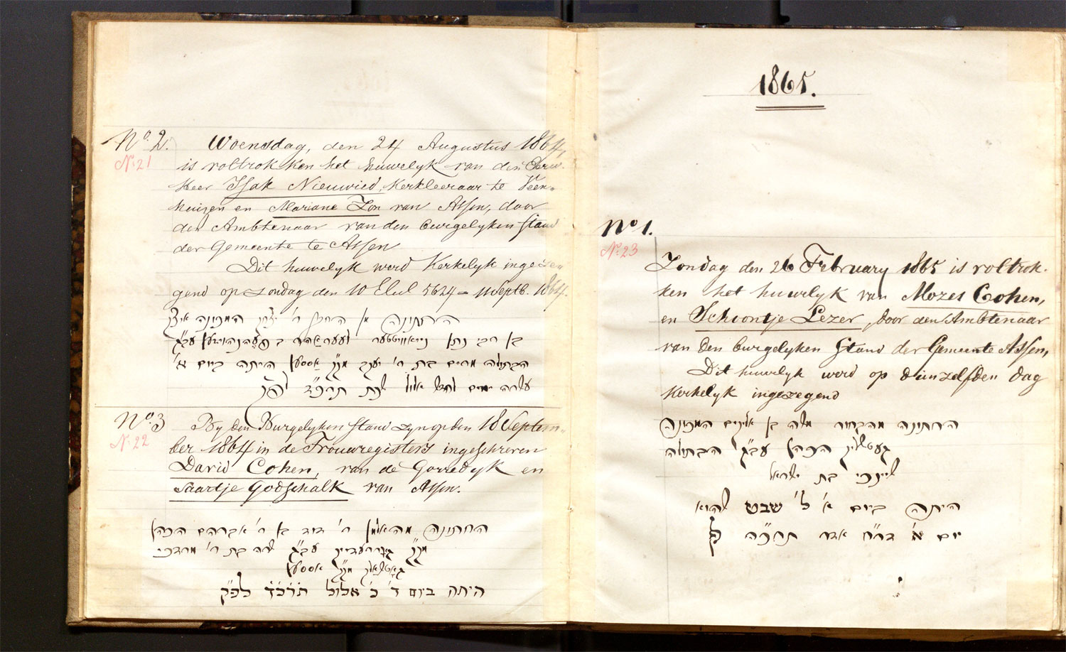 | 26.02.1865 | Mozes Cohen | Schoontje Lezer | ja | |